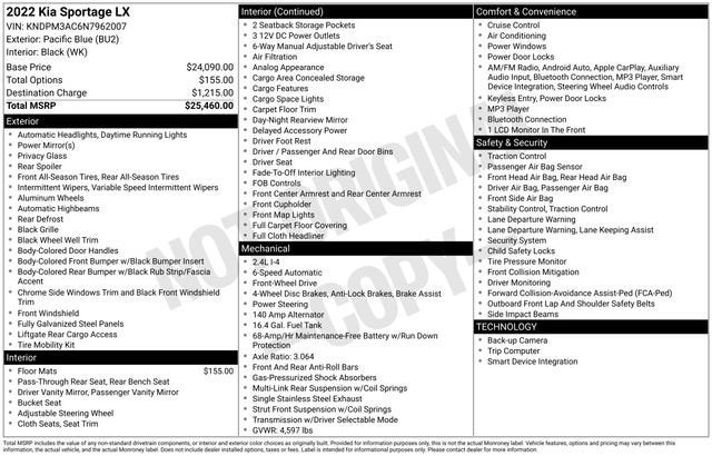 Powered by a 2.4L I4 DGI DOHC 16V engine mated to a 6-Speed Automatic Electronic with Overdrive transmission, the 2022 Sportage LX delivers a smooth and efficient performance, boasting an impressive 23 city/30 highway MPG. This front-wheel-drive SUV offers the perfect blend of agility and capability, making it an ideal choice for your daily commute or weekend adventures.